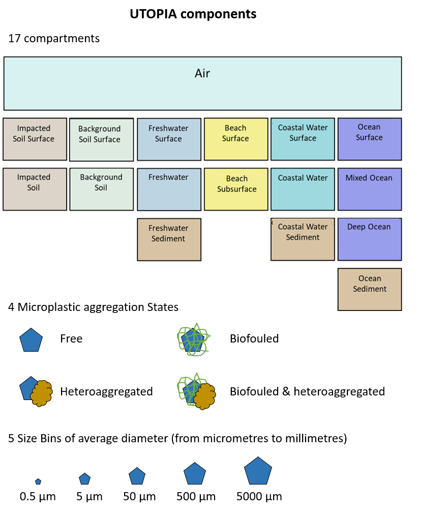 UTOPIA is a platform to synthesize knowledge and understanding about the fate of microplastics in the environment. The model tracks plastic pollution in 17 environmental compartments that cover the air, different types of soils, water, and sediments, in five size bins, ranging from nanometers to millimeters, and in four speciation states (free, heteroaggregated, biofouled and biofouled and heteroaggregated).